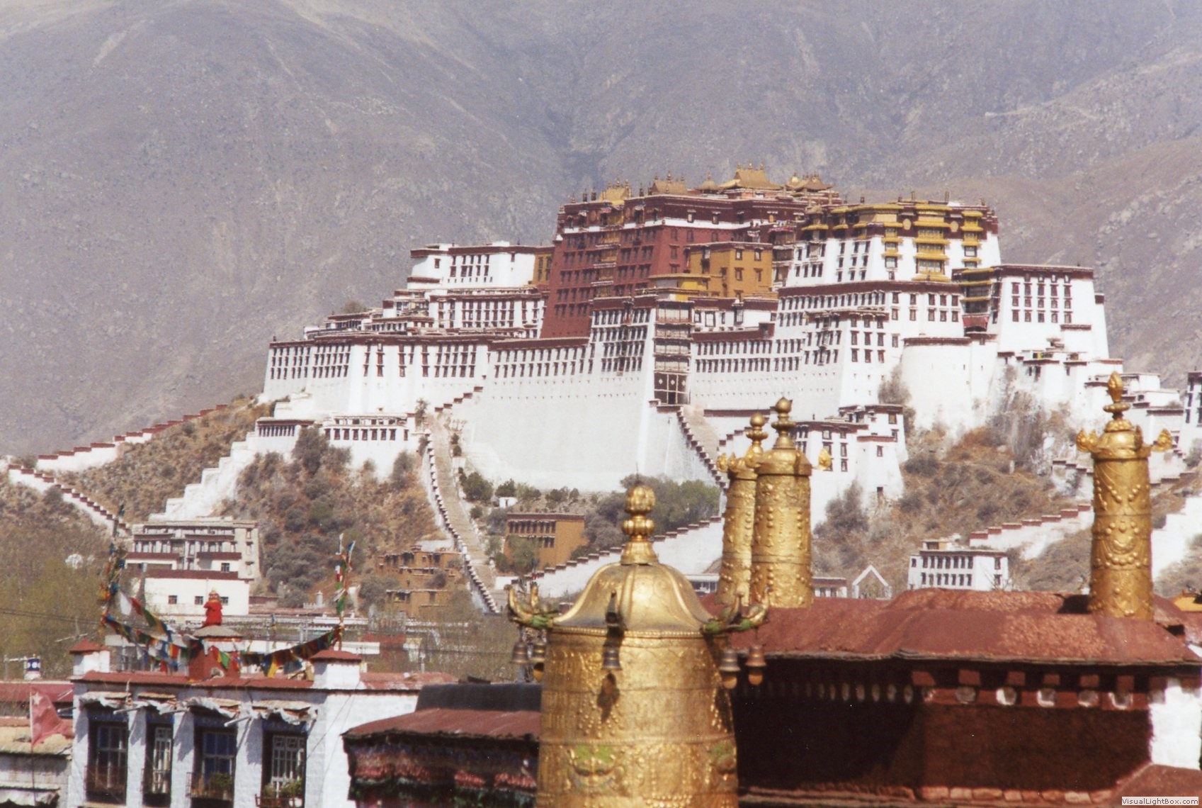 worshipers walking around the temple, clockwise, with a Prayer Wheel.