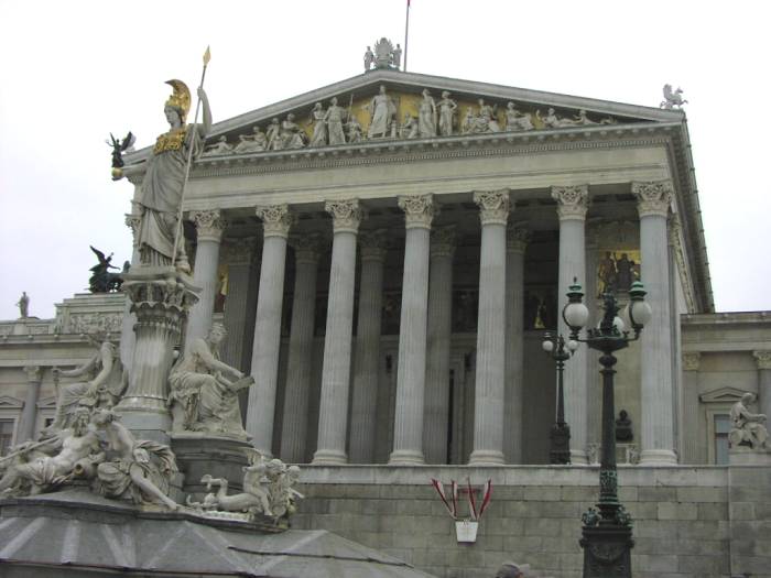 Pallas Athena Fountain in front of it; this 15-foot figure of the Greek