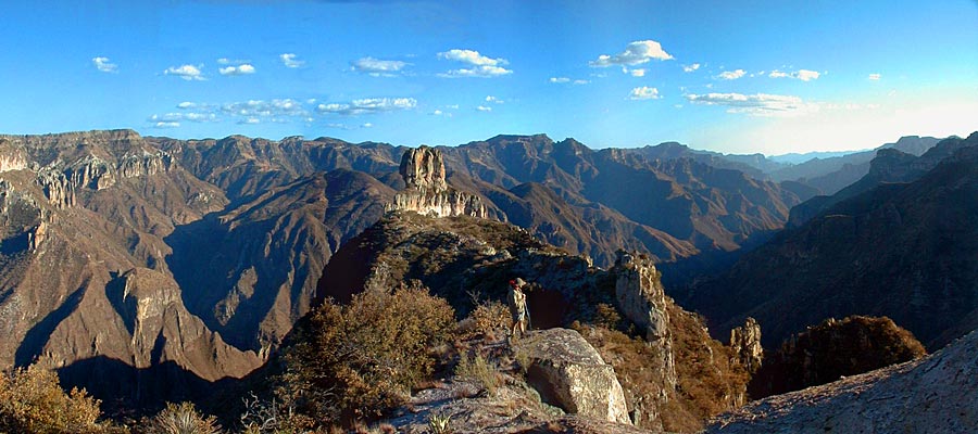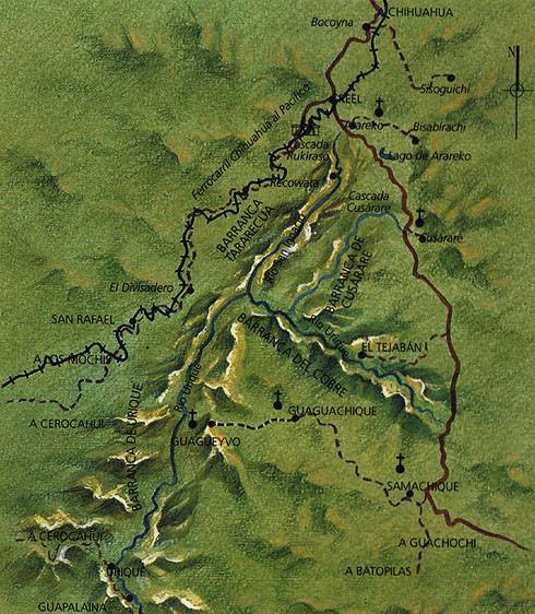 Urique Canyon is the deepest canyon in the Sierra Tarahumara at 1,879 meters (6,200 feet). The best place to enjoy a view of the canyon is near Cerocahui. The view point called "Mirador de la Mesa de Arturo" and the Cerro del Gallego peak are outstanding for their panoramic views and horizons full of ravines and blue skies. You'll see the Urique River and the town of Urique below. |
