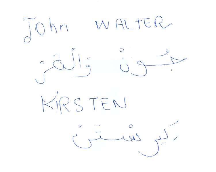 ![]() Our host was kind enough to write our names in Arabic (goes right to left) |