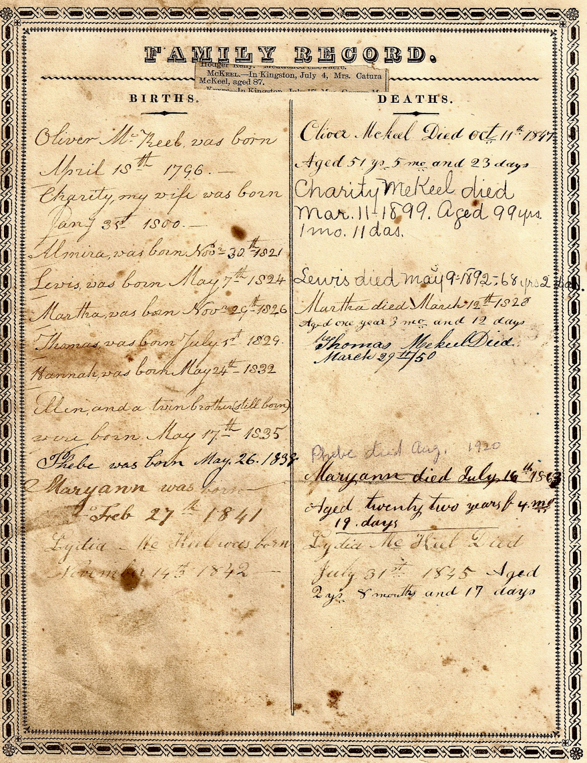 Kingston, Pennsylvania. Harry Cecil Mekeel died on 29 Dec 1965. (photo Mekeel homestead, Lehman, PA) (photo bible page from Oliver Mekeel - g-grandfather of Harry) Harry Cecil Mekeel married Jennie Hope on 17 Feb 1908. Jennie Hope was born on 17 Aug 1888 in Wilkes-Barre, Pennsylvania. Her parents were Charles Hope (b. Feb 1863-d.??) and Katherine Evans (b. 1864- d. ??); born her parents were born in Wales. Her parents were married on 21 Oct 1886. Jennie Hope died on 8 Feb 1927 in Lehman, Pennsylvania. Harry Cecil Mekeel and Jennie Hope had the following known children: (photo of Harry and Jennie)