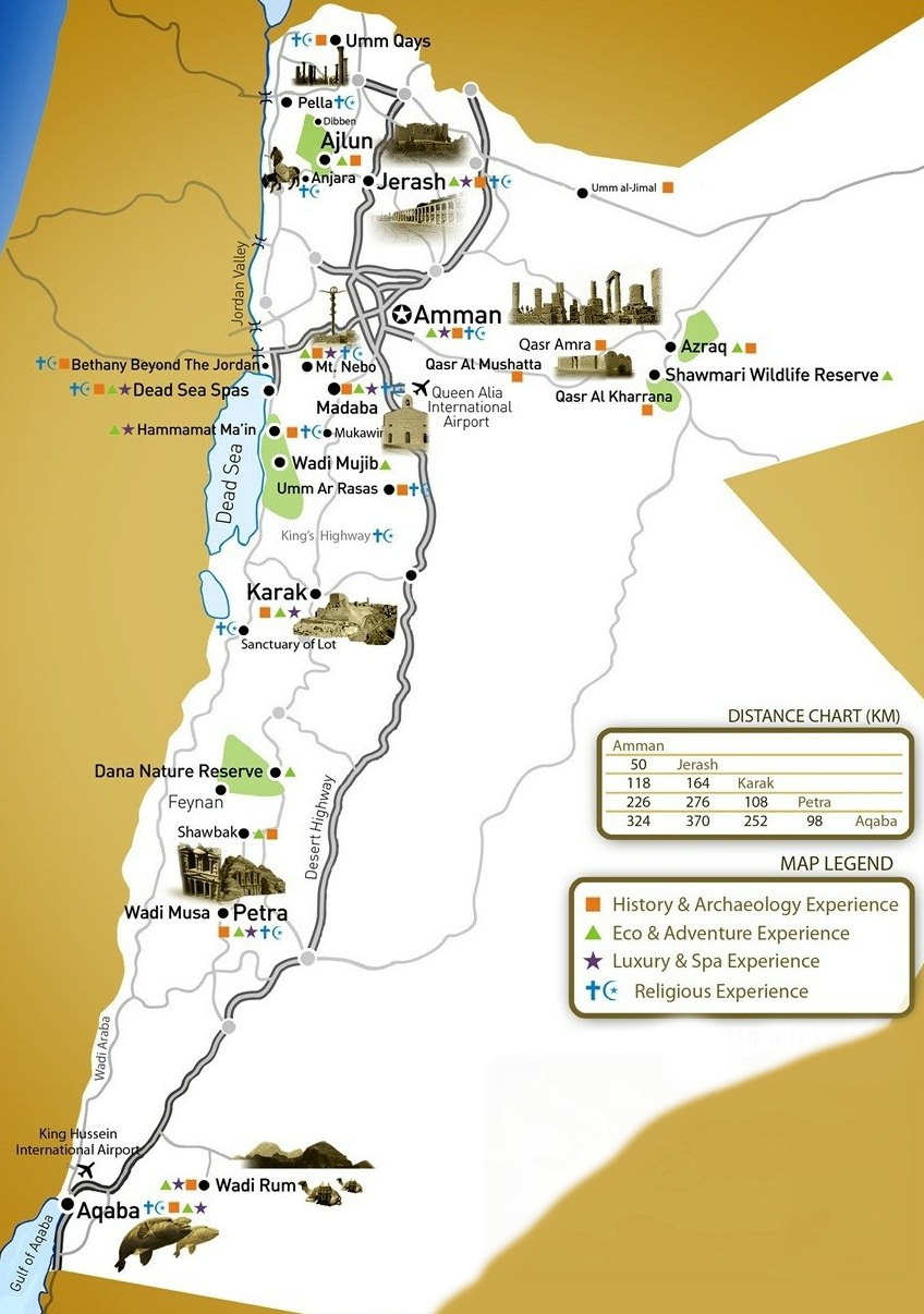 This trip was an extension to the vacation in Egypt. We flew from Cairo to Amman, Jordan. The capital city was very clean with a modern look and feel. Signs were in English and Arabic, so it was easy to get around. Most everybody spoke English, which also made things go easier. The images were scanned from photographs taken on our trip. Our guide for this trip was a Christian, born in Madaba, Jordan. He accompanied us on all our excursions. The places we visited included: Amman, Jerash, The Dead Sea, , Ajlun Castle, traveled the King's Highway to Madaba, Mt. Nebo, and Petra. We had dinner with a local family in Amman. The family consisted of 11 children (not all were at home when we visited) and our group of 10. We had a great dinner talking with the children who were learning English. Overall the trip was very enjoyable. Our destinations are in the order on the menu links on the left. The map below shows Amman and the trip north to Jerash & Ajlun fortress. The rest of the trip was south on the King's (Desert) Highway to Petra.